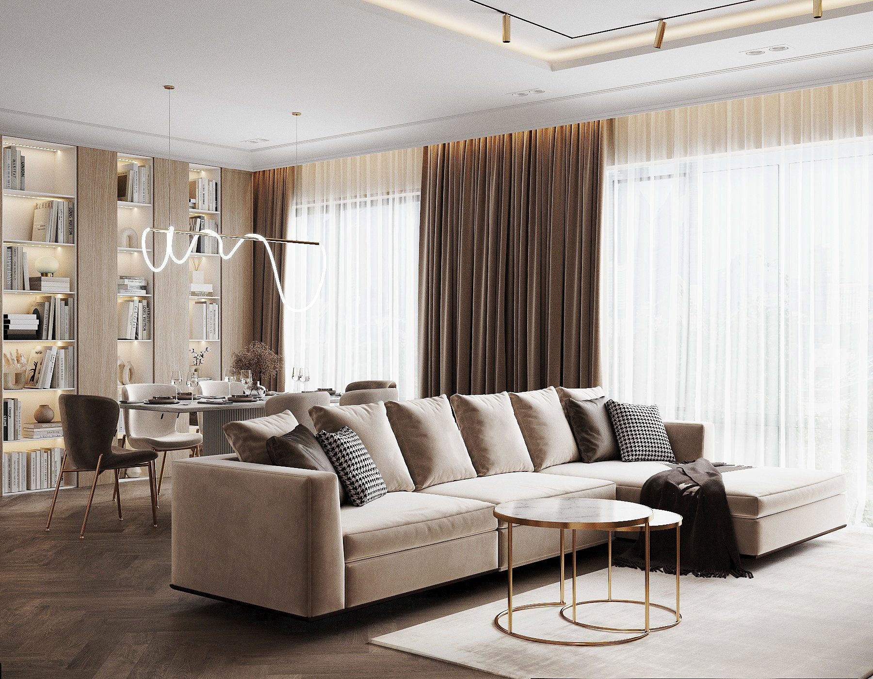 В ней продумывают основные черты интерьера. Дизайнер берет за основу материалы, цвета отделки из технического задания и на их основе создает трехмерные модели. Благодаря визуализациям можно увидеть интерьер с конкретным паркетом, обоями, декоративными панелями и другой отделкой. Заказчик принимает активное участие в построении визуализаций. Они с дизайнером обсуждают детали, корректируют цвет и другие нюансы. После того как гостиную заканчивают переходят к другим комнатам.