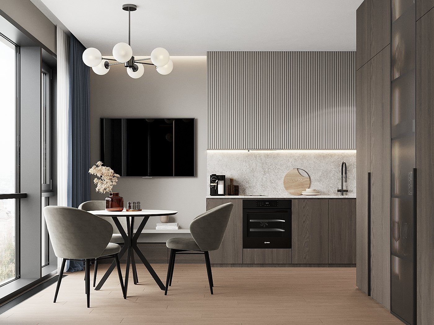 Дизайн в стиле контемпорари открыт для современных решений, которые могут упростить быт и создать комфортные условия для жизни. Автоматические шторы, светильники, которые меняют яркость и оттенок света, встроенная техника — все это отлично вписывается в дизайн контемпорари.