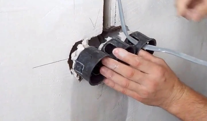 Чтобы закрепить подрозетник, нужно закрутить винты, которые прижмут его к гипсокартону.